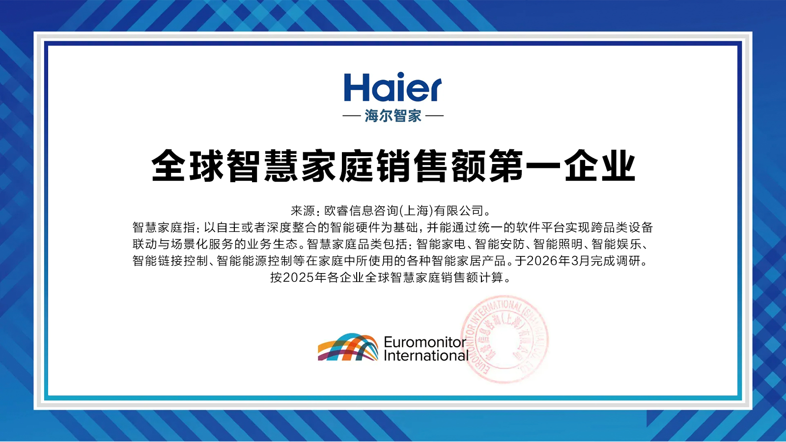3月10日,世界权威市场研究机构欧睿国际数据显示:海尔智家获全球智慧家庭销售额第一企业。据了解,该认证依据2025年企业在全球市场各类智能家居产品销售额统计得出。这是继家电17连冠后,海尔智家在智慧住居赛道取得的又一新成果。