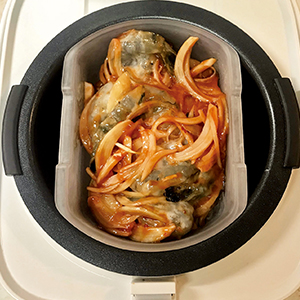 - 内鍋に白米を水加減し、本体にセットし、クックトレイを写真の向きでのせ、調理を開始する。