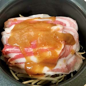 - 内鍋にもやしを入れ、豚肉を広げてのせAを広げながら加え、本体にセットし、調理を開始する。