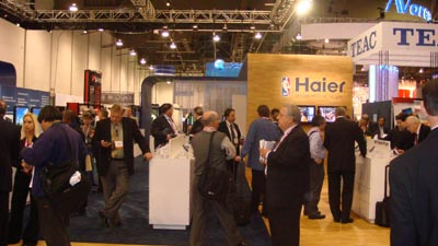 海尔在中央厅展出了高 科技 创新产品,包括海尔“宝蓝”T系列、K系列26寸-52寸高清流媒体电视,海尔高端手机、便携式音乐播放器等。海尔展厅与索尼等品牌展厅毗邻,成为展会的一大亮点。