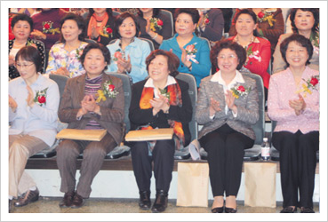 图片说明:在颁奖典礼上海尔集团总裁杨绵绵(中)和青岛女企业家、青岛市领导在一起