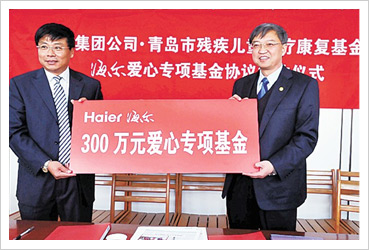 2009年12月17日上午,海尔集团和青岛市残疾儿童医疗康复基金会300万元“海尔爱心专项基金”签约仪式在青岛市儿童医院举行,专项基金每年的8万元利息将用于改善病房环境,帮助家庭贫困的病残儿童更好地接受治疗,获得康复。