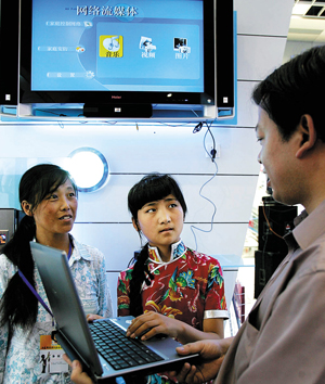 图片说明:“山东大嫚”形象代言人彭彦辉(中)正在用计算机远程控制海尔家电。(《大众日报》摄影部主任 钱捍 摄)