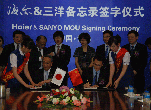 2011年7月28日, 青岛,中国 / 大阪,日本 - 海尔集团公司 (“海尔”) 和日本三洋电机株式会社 (“三洋电机”) 今天就海尔意向收购三洋电机在日本、印度尼西亚、马来西亚、菲律宾和越南的洗衣机、冰箱和其它家用电器业务签署备忘录(“备忘录”)。海尔此次收购涉及在上述区域的三洋电机洗衣机、冰箱的研发、制造以及所收购公司家用电器的销售和服务业务, 收购亦包括三洋洗衣机品牌AQUA以及相关品牌。同时, 双方就“SANYO”标识的使用达成一致。此次收购完成后,海尔在日本市场将实现“Haier”和”AQUA”双品牌运营;在越南、印度尼西亚、菲律宾和马来西亚市场,海尔在运营“Haier”品牌的同时, 将在指定期间内同步运营“SANYO”品牌。