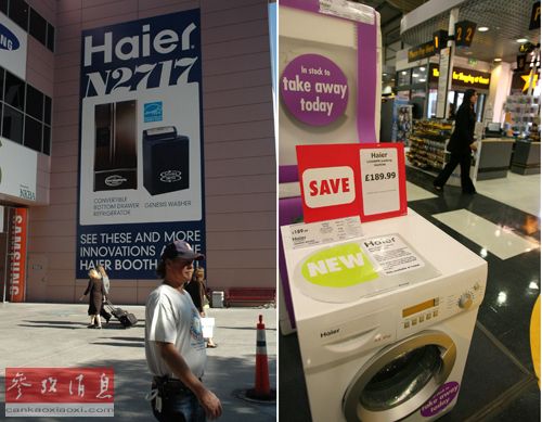 资料图片:人们从美国拉斯韦加斯会展中心的巨幅海尔冰箱广告前走过(左,2007年5月9日摄);海尔洗衣机摆放在英国著名电器销售商COMET位于伦敦郊区的一家连锁店里(2008年1月21日摄)(拼版照片)。新华社发