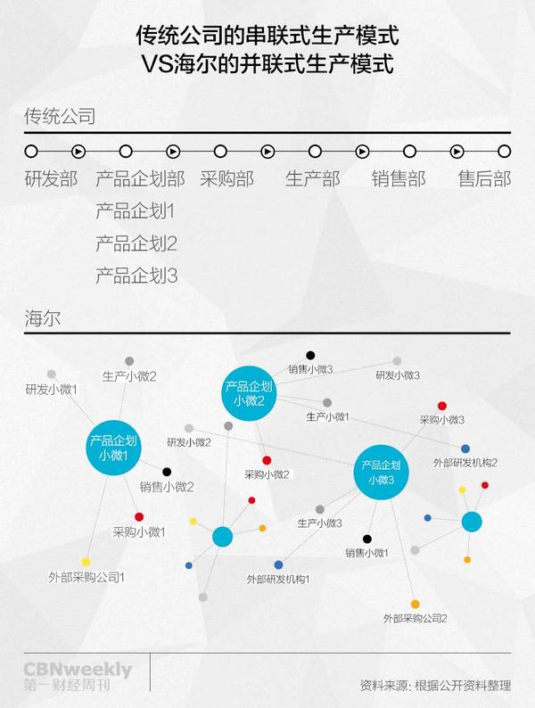 传统模式中,每个职能部门的工作都像是产品上市流程中的一道工序,张瑞敏把这种组织生产方式称为“串联”。产品企划者提出创意后,就交付给这个大系统去运作,类似宝洁等跨国公司品牌经理的职责。在海尔新模式中,产品企划者可以“全流程”地把控一款产品的供应链,这种模式被称为“并联”。