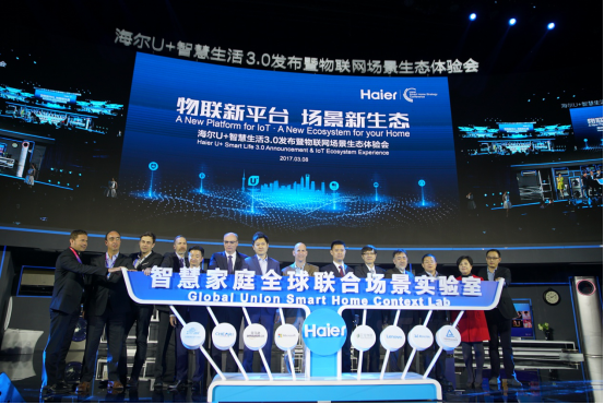 3月8日,上海AWE前夕,海尔以“物联新平台 场景新生态”为主题,举办了“海尔U+智慧生活3.0发布暨物联网场景生态体验会”,发布海尔智慧家庭战略,智慧家庭场景生态,智慧家庭市场策略以及智能制造平台。更值得一提的是,为推动智慧家庭的快速引爆落地,了解用户需求,海尔联合中国家电研究院、中国智慧生活产业联盟、亚马逊、微软、德国TUV、联想、Ayla Networks 以及Realteck瑞昱,成立全球联合场景实验室Smart Home Context Lab并举行隆重的揭牌仪式。此举,代表着海尔将聚合全球行业翘楚的技术力量,围绕全球用户的智慧场景生态在专业技术领域开展合作,催生更多的场景生态解决方案,以求快速迭代出智慧场景生态服务需求,引领智慧家庭产业实现新的跨越,创用户最佳生活体验。